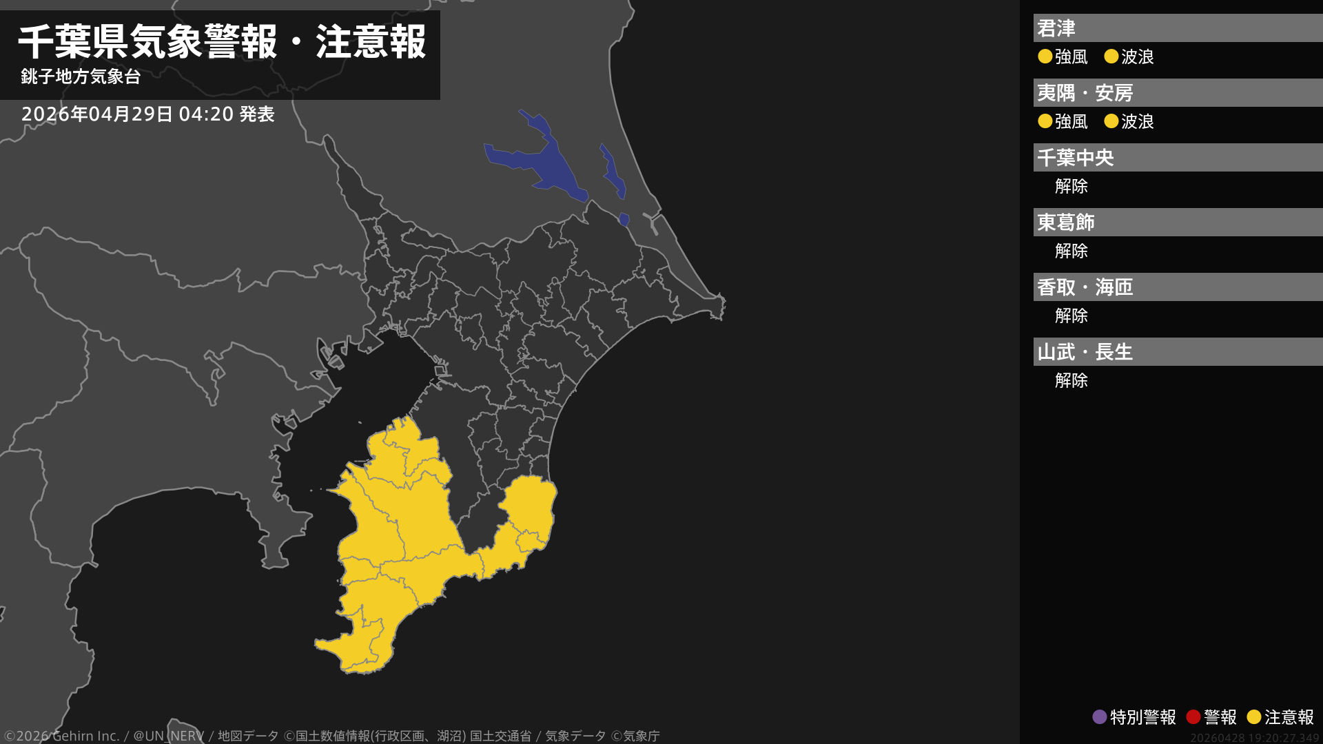 【千葉県 気象警報・注意報 2026年04月29日 04:20】南部では、29日昼前まで強風や高波に注意してください。#気象警報注意報 #千葉県