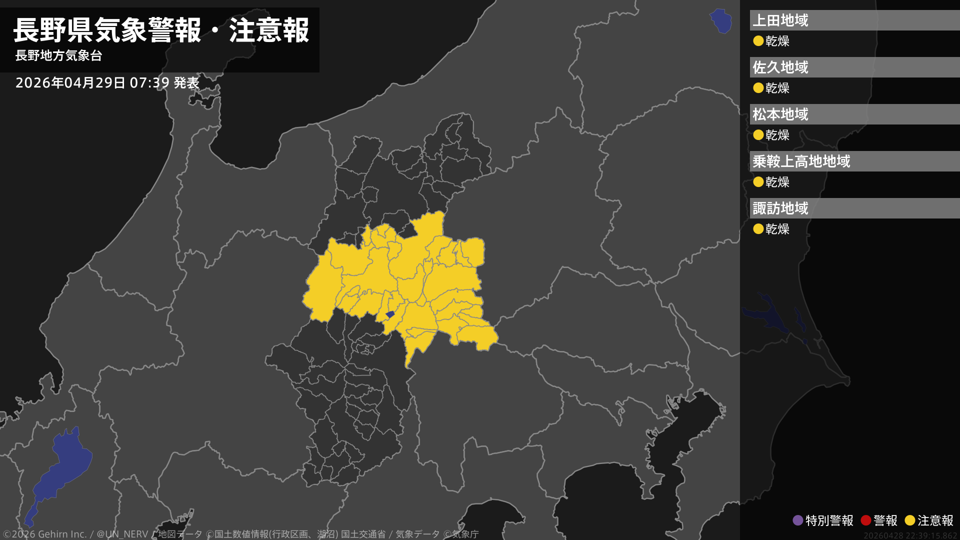 【長野県 気象警報・注意報 2026年04月29日 07:39】中部では、29日まで空気の乾燥した状態が続くため、火の取り扱いに注意してください。#気象警報注意報 #長野県