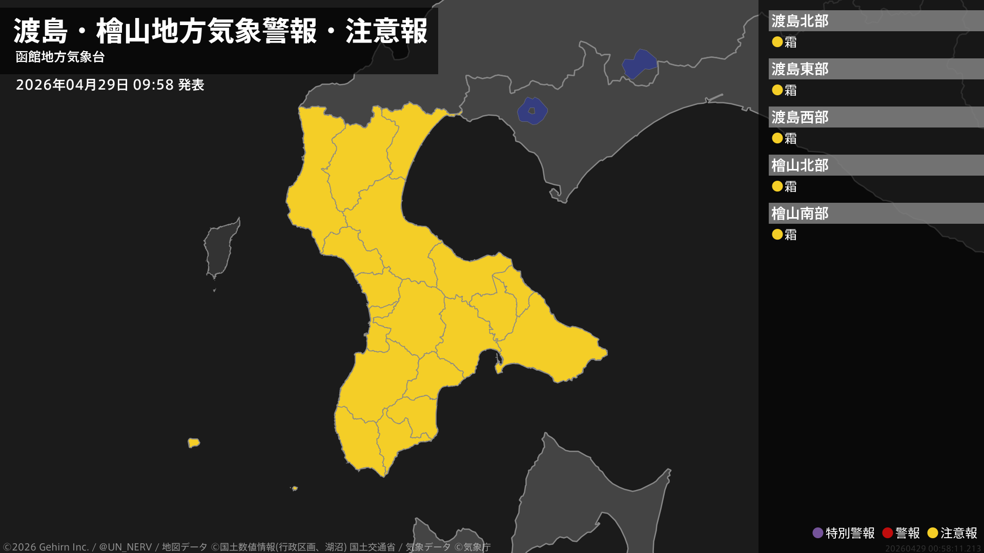 【渡島・檜山地方 気象警報・注意報 2026年04月29日 09:58】渡島、檜山地方では、30日朝は霜に対する農作物の管理に注意してください。#気象警報注意報 #渡島地方 #檜山地方