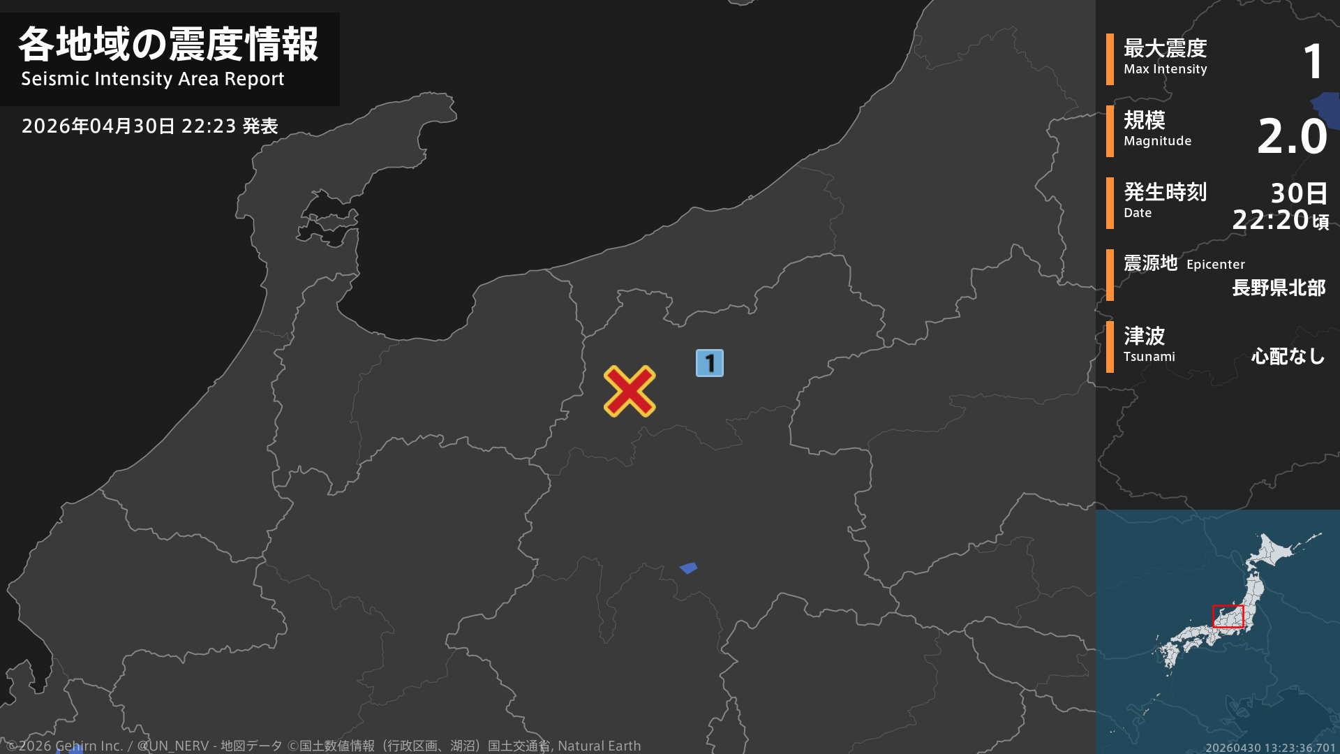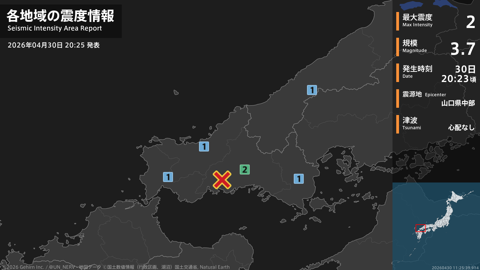 20時23分頃、山口県中部を震源とする地震がありました。今後の情報に注意してください。