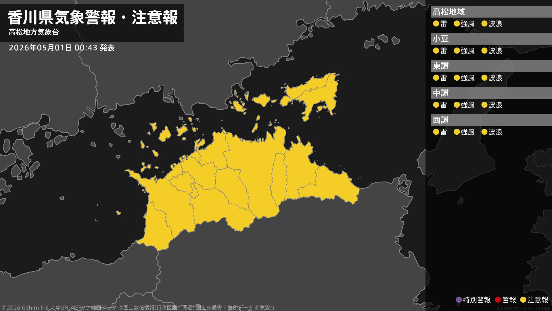 【香川県 気象警報・注意報 2026年05月01日 00:43】香川県では、1日朝から1日夜遅くまで強風や高波に、1日明け方から1日夕方まで竜巻などの激しい突風や急な強い雨、落雷に注意してください。#気象警報注意報 #香川県