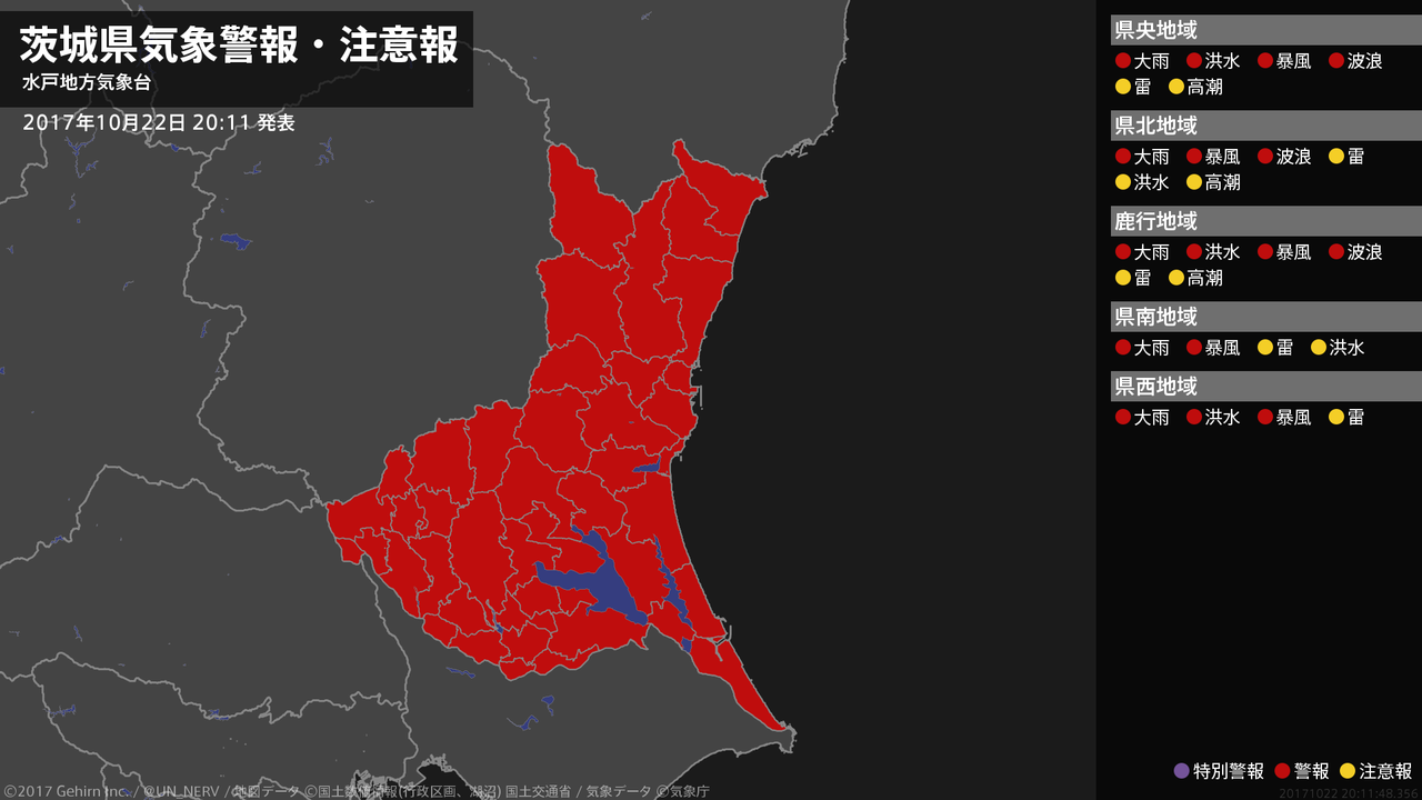 茨城県では、土砂災害や低い土地の浸水、河川の増水、暴風、高波に警戒してください。