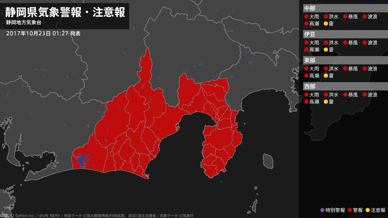 【静岡県 気象警報 2017年10月23日 01:32】静岡県では、土砂災害や低い土地の浸水、河川の増水、暴風、高波、高潮に警戒してください。#気象警報 #気象警報注意報 #静岡県