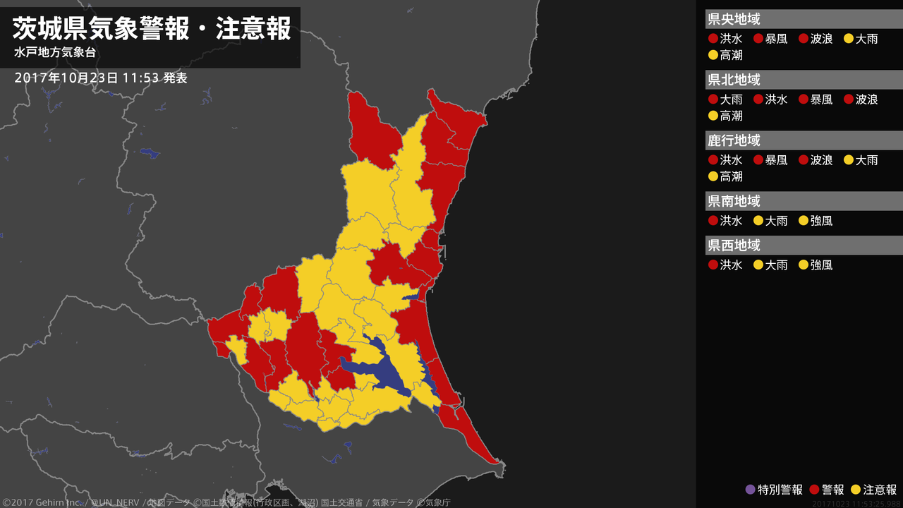 【茨城県 気象警報 2017年10月23日 11:53】北部では、土砂災害に警戒してください。茨城県では、河川の増水や暴風、高波に警戒してください。#気象警報 #気象警報注意報 #茨城県