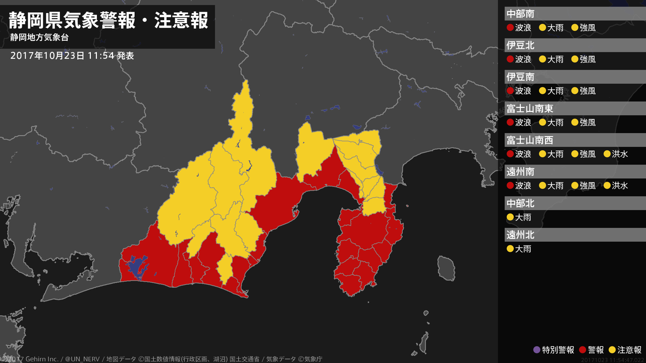 【静岡県 気象警報・注意報 2017年10月23日 11:54】東部では23日昼過ぎまで、中部、伊豆、西部では23日夕方まで、高波に警戒してください。#気象警報注意報 #静岡県