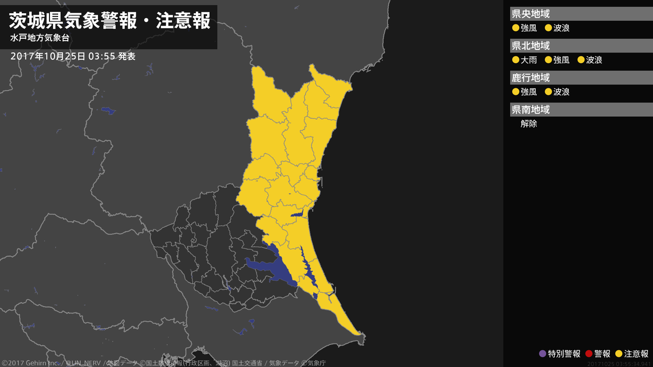 【茨城県 気象警報・注意報 2017年10月25日 03:55】北部では、土砂災害に注意してください。茨城県では、強風や高波に注意してください。#気象警報注意報 #茨城県
