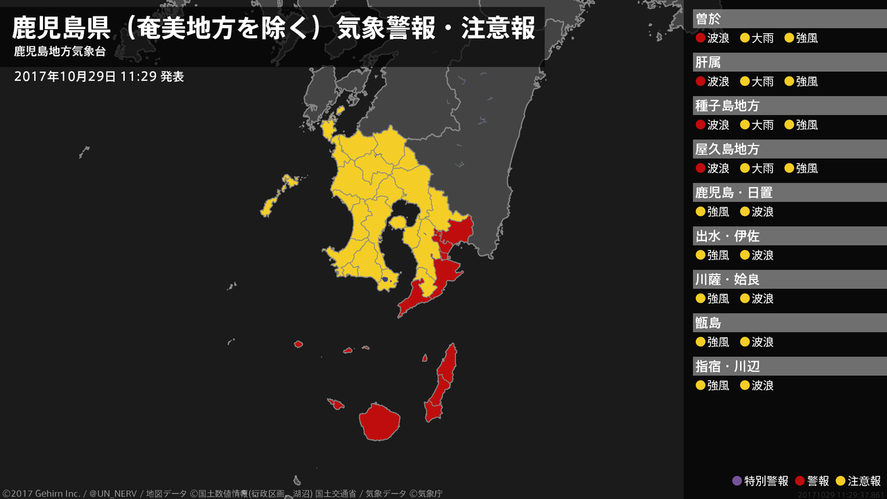 【九州南部・奄美地方 気象情報 2017年10月29日 11:18】九州南部では29日昼過ぎにかけて暴風に、29日昼前にかけて土砂災害、河川の増水や氾濫に厳重に警戒してください。九州南部・奄美地方では29日昼過ぎにかけてうねりを伴った高波に警戒してください。#気象情報 #九州南部・奄美地方