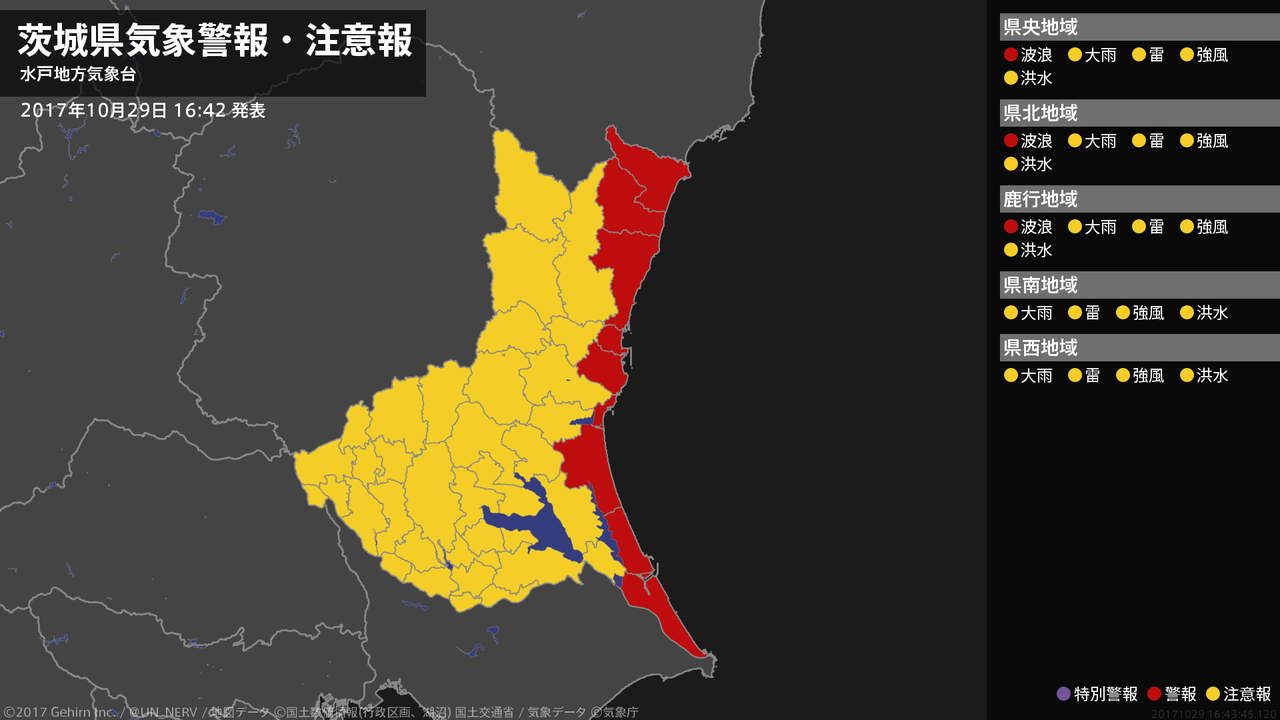【茨城県 気象警報 2017年10月29日 16:43】茨城県では、29日夜遅くから30日明け方まで高波に警戒してください。#気象警報 #気象警報注意報 #茨城県