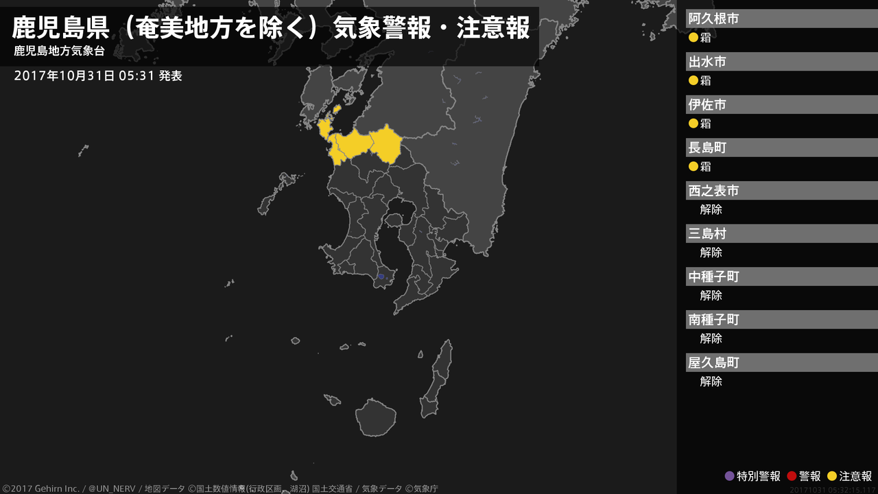 【鹿児島県(奄美地方を除く) 気象警報・注意報 2017年10月31日 05:32】薩摩地方では、31日朝は霜に対する農作物の管理に注意してください。#気象警報注意報 #鹿児島県(奄美地方除く)