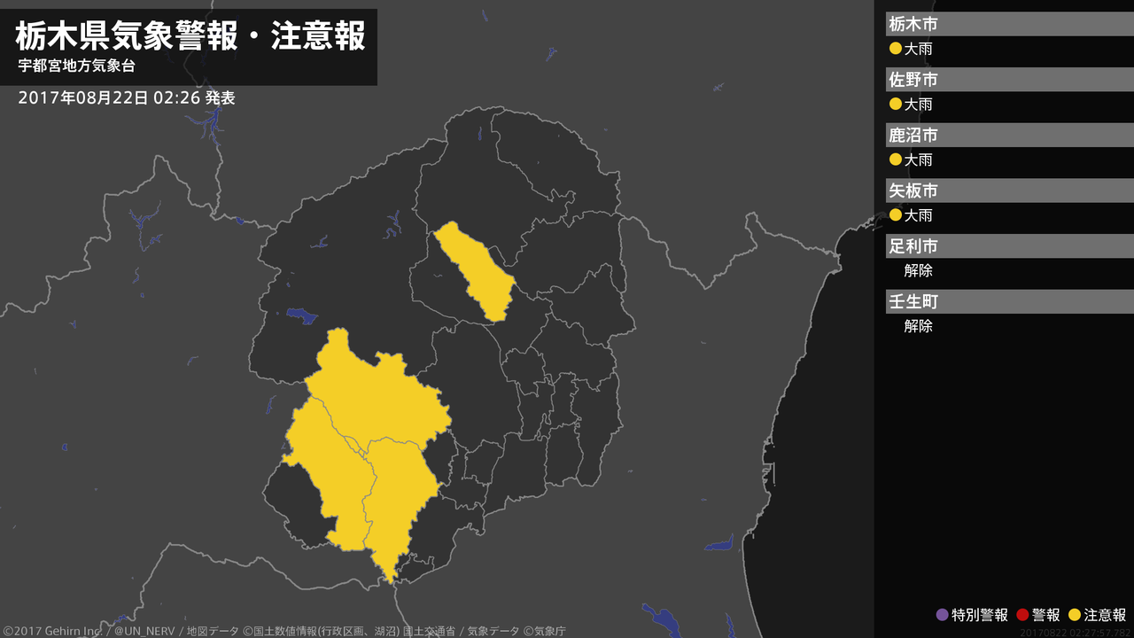 【栃木県 気象警報(解除) 2017年08月22日 02:27】