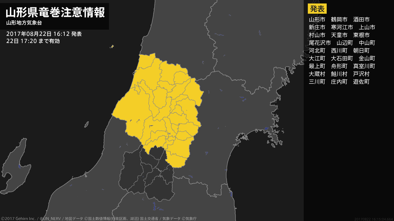 【山形県 竜巻注意情報】山形県は、竜巻などの激しい突風が発生しやすい気象状況になっています。頑丈な建物内に移動するなど安全確保に努めてください。この情報は22日17:20まで有効です。#竜巻注意情報 #山形県