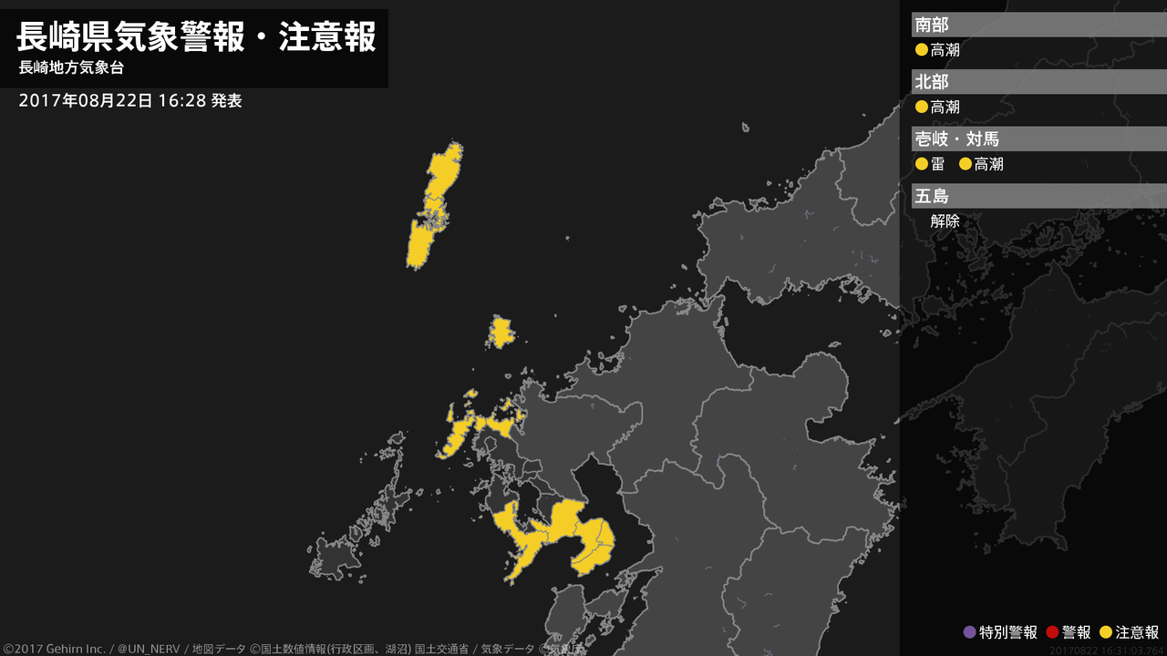 【長崎県 気象警報・注意報 2017年08月22日 16:31】南部、北部、壱岐・対馬では、23日まで高潮に注意してください。壱岐・対馬では、23日昼前まで急な強い雨や落雷に注意してください。#気象警報注意報 #長崎県