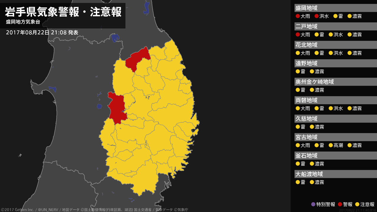 【岩手県 気象警報 2017年08月22日 21:11】内陸では、23日明け方まで土砂災害や河川の増水に警戒してください。#気象警報 #気象警報注意報 #岩手県