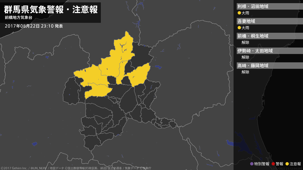 【群馬県 気象警報・注意報 2017年08月22日 23:12】北部では、23日明け方まで土砂災害に注意してください。#気象警報注意報 #群馬県