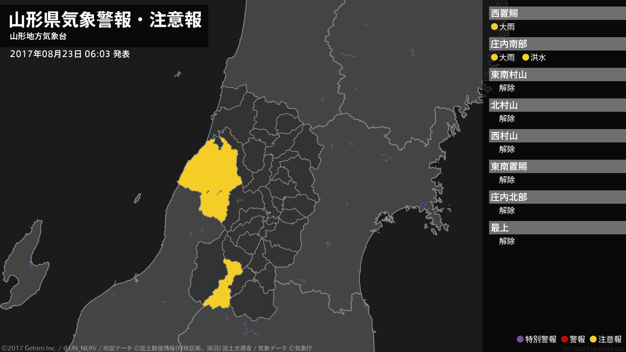 【山形県 気象警報・注意報 2017年08月23日 06:05】置賜、庄内では、23日昼前まで土砂災害に注意してください。庄内では、23日昼前まで河川の増水に注意してください。#気象警報注意報 #山形県