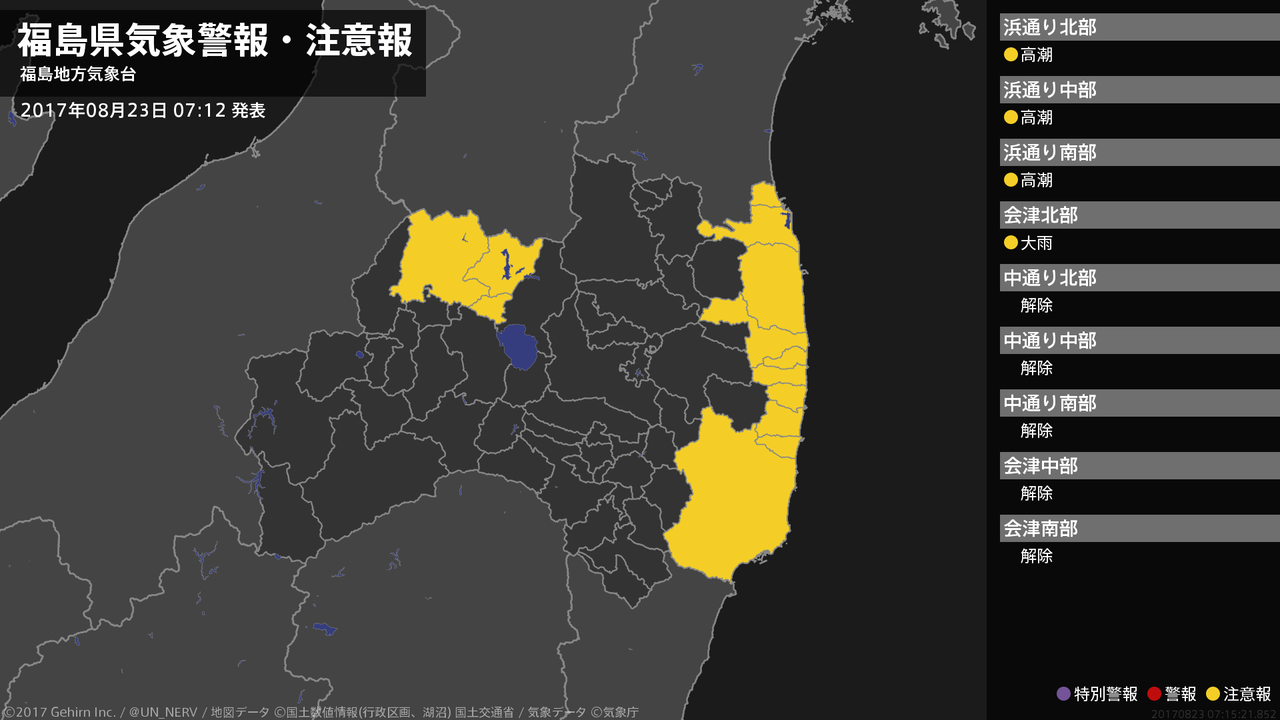 【福島県 気象警報・注意報 2017年08月23日 07:15】会津では、23日昼前まで土砂災害に注意してください。浜通りでは、25日まで高潮に注意してください。#気象警報注意報 #福島県