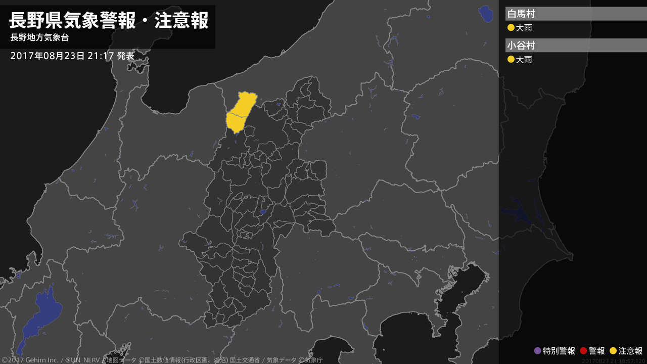 【長野県 気象警報・注意報 2017年08月23日 21:18】北部では、24日明け方まで土砂災害に注意してください。#気象警報注意報 #長野県