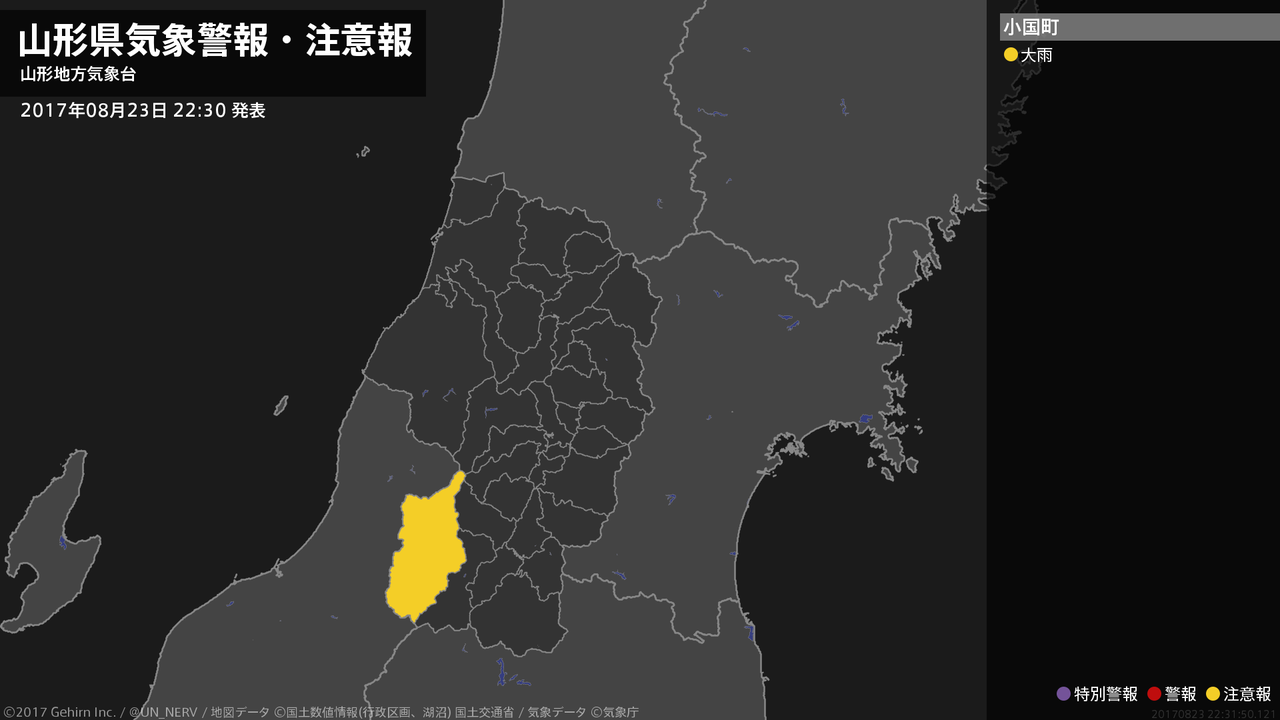 【山形県 気象警報・注意報 2017年08月23日 22:31】置賜では、24日未明まで土砂災害に注意してください。#気象警報注意報 #山形県
