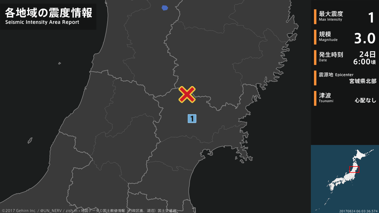 【地震情報 2017年8月24日】06時00分頃、宮城県北部を震源とする地震がありました。震源の深さは約10km、地震の規模はM3.0、最大震度1を宮城県で観測しています。この地震による津波の心配はありません。#地震 #宮城県