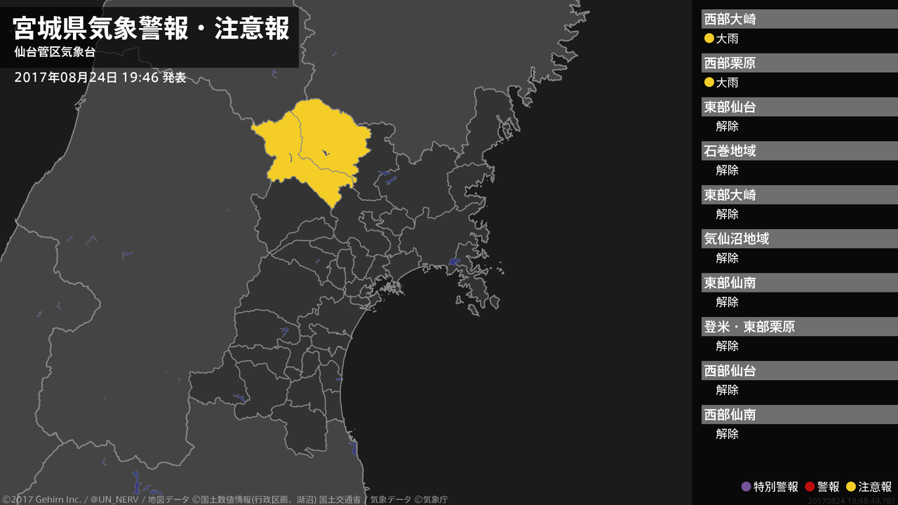 【宮城県 気象警報(解除) 2017年08月24日 19:48】宮城県に発表されていた気象警報はすべて解除されました。西部では、25日明け方まで土砂災害に注意してください。#気象警報 #宮城県