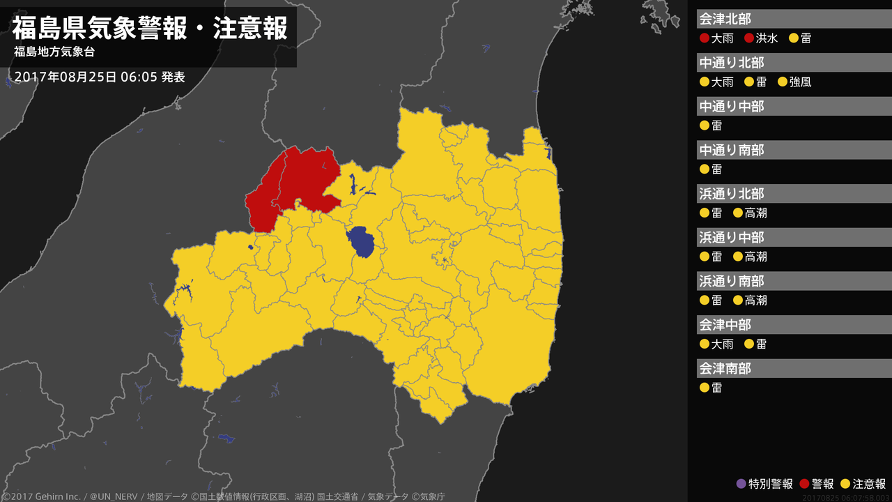【福島県 気象警報 2017年08月25日 06:07】会津では、25日昼前まで土砂災害や河川の増水に警戒してください。#気象警報 #気象警報注意報 #福島県