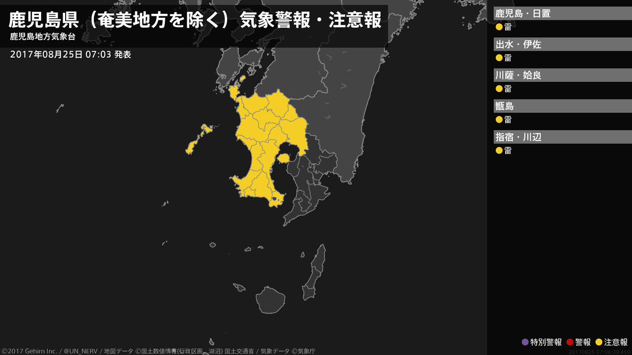 【鹿児島県(奄美地方を除く) 気象警報・注意報 2017年08月25日 07:06】薩摩地方では、25日昼前まで急な強い雨や落雷に注意してください。#気象警報注意報 #鹿児島県(奄美地方除く)