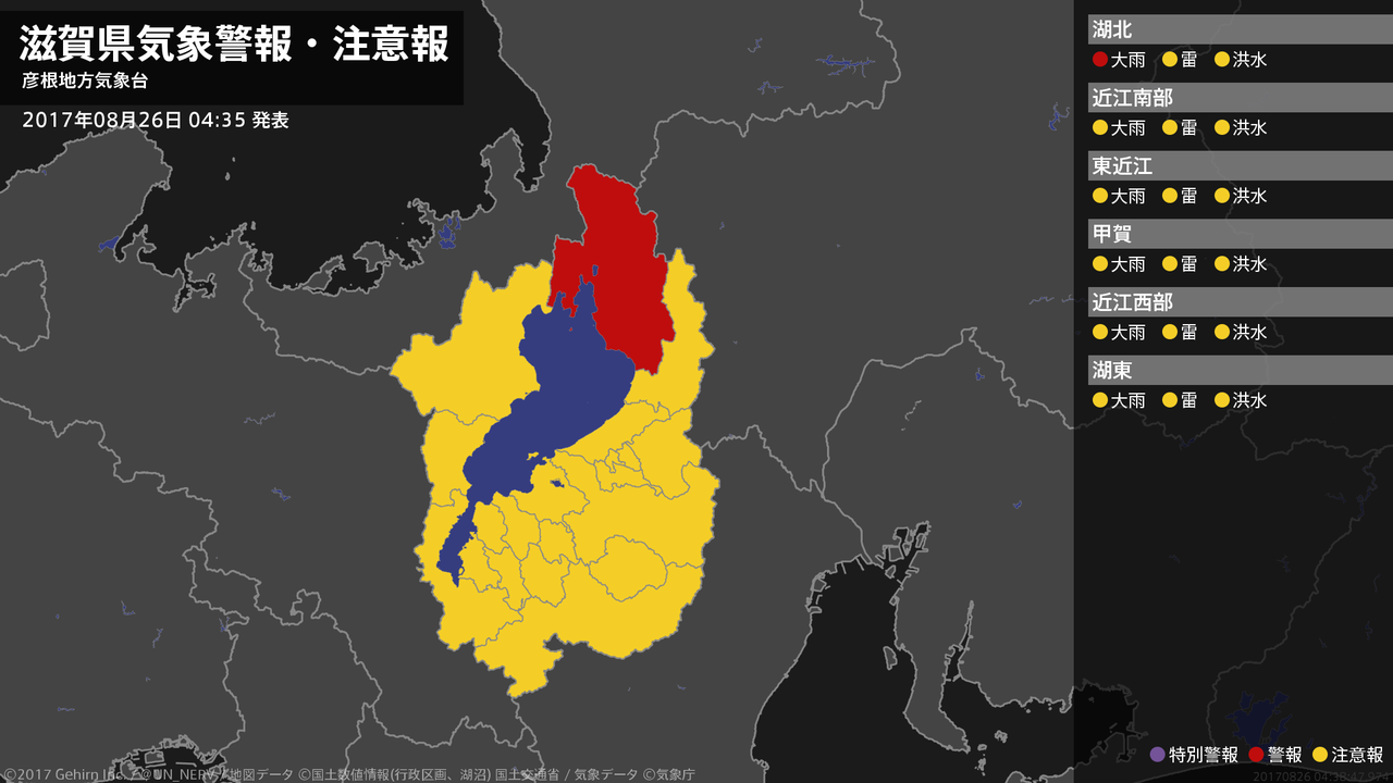 【滋賀県 気象警報 2017年08月26日 04:38】北部では、26日朝まで土砂災害に警戒してください。#気象警報 #気象警報注意報 #滋賀県
