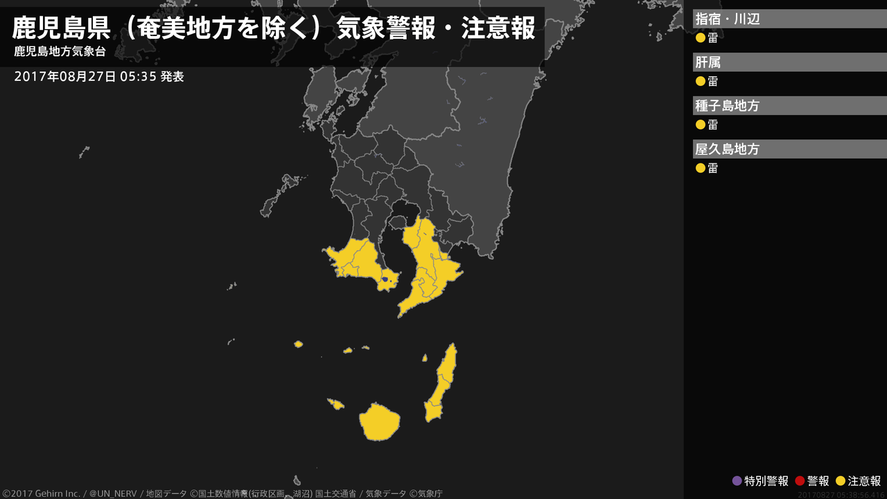 【鹿児島県(奄美地方を除く) 気象警報・注意報 2017年08月27日 05:38】薩摩、大隅地方では27日昼前まで、種子島・屋久島地方では27日夕方まで、急な強い雨や落雷に注意してください。#気象警報注意報 #鹿児島県(奄美地方除く)