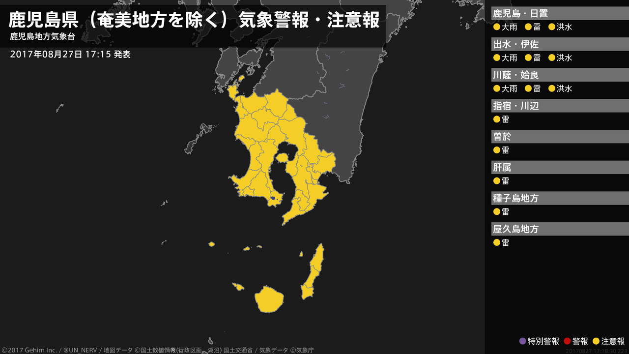 【鹿児島県(奄美地方を除く) 気象警報・注意報 2017年08月27日 20:41】薩摩地方では、28日明け方まで土砂災害に注意してください。薩摩、大隅、種子島・屋久島地方では、28日明け方まで落雷に注意してください。#気象警報注意報 #鹿児島県(奄美地方除く)