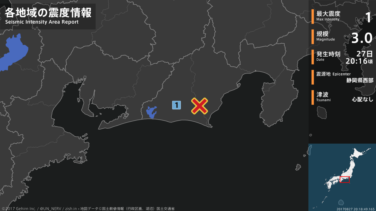 【地震情報 2017年8月27日】20時16分頃、静岡県西部を震源とする地震がありました。震源の深さは約30km、地震の規模はM3.0、最大震度1を静岡県で観測しています。この地震による津波の心配はありません。#地震 #静岡県