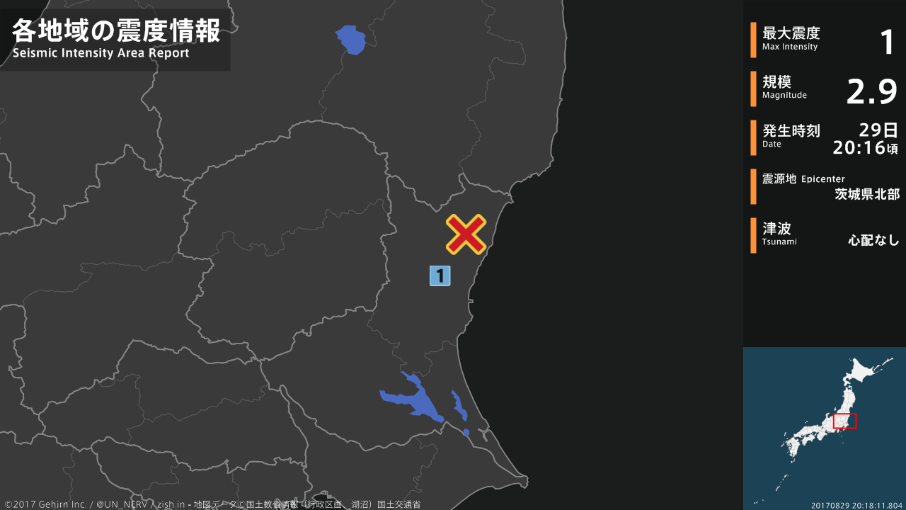 【地震情報 2017年8月29日】20時16分頃、茨城県北部を震源とする地震がありました。震源の深さは約10km、地震の規模はM2.9、最大震度1を茨城県で観測しています。この地震による津波の心配はありません。#地震 #茨城県