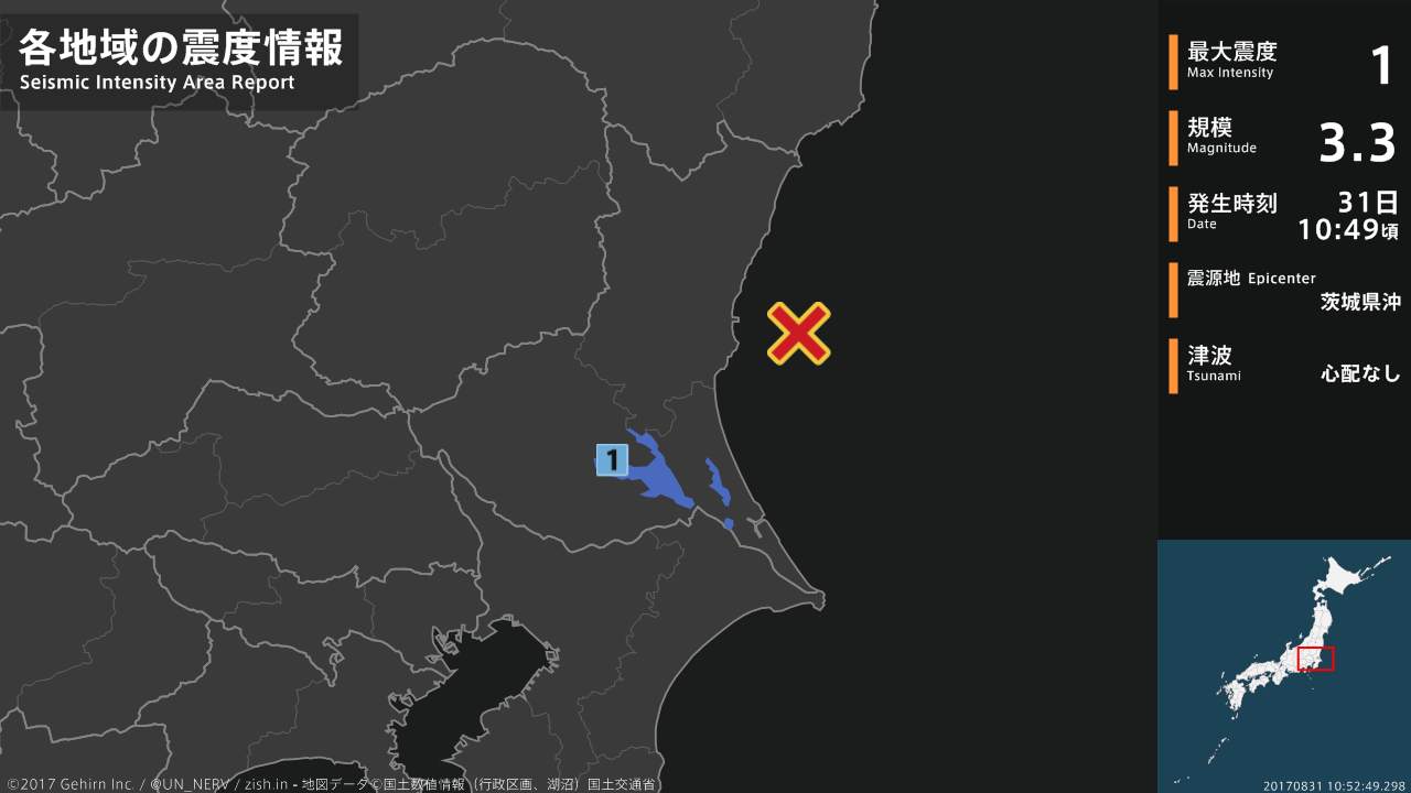 10時49分頃、茨城県沖を震源とする地震がありました。震源の深さは約60km、地震の規模はM3.3、最大震度1を茨城県で観測しています。この地震による津波の心配はありません。