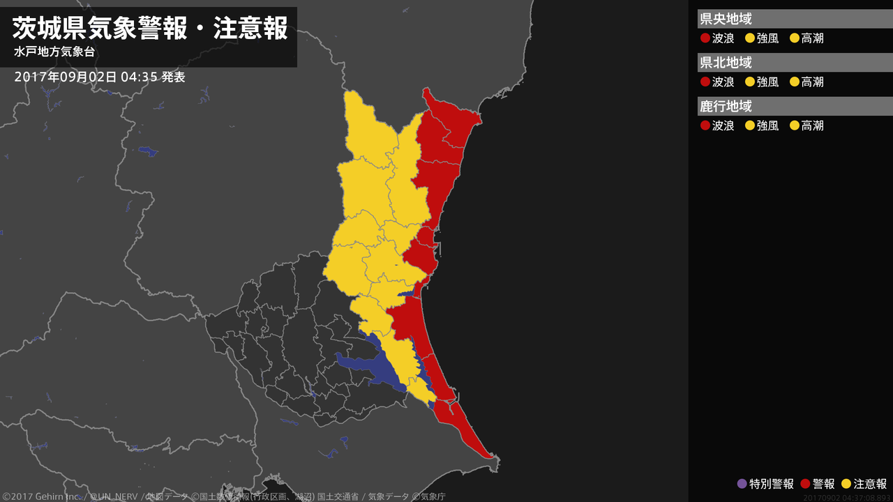 【茨城県 気象警報 2017年09月02日 04:37】茨城県では、2日昼前から3日明け方まで高波に警戒してください。#気象警報 #気象警報注意報 #茨城県