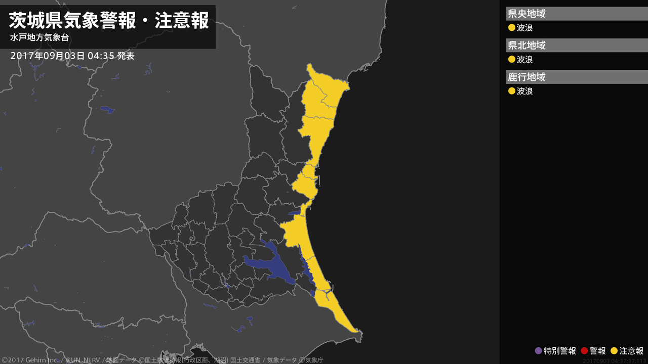 【茨城県 気象警報(解除) 2017年09月03日 04:37】茨城県に発表されていた気象警報はすべて解除されました。茨城県では、高波に注意してください。#気象警報 #茨城県