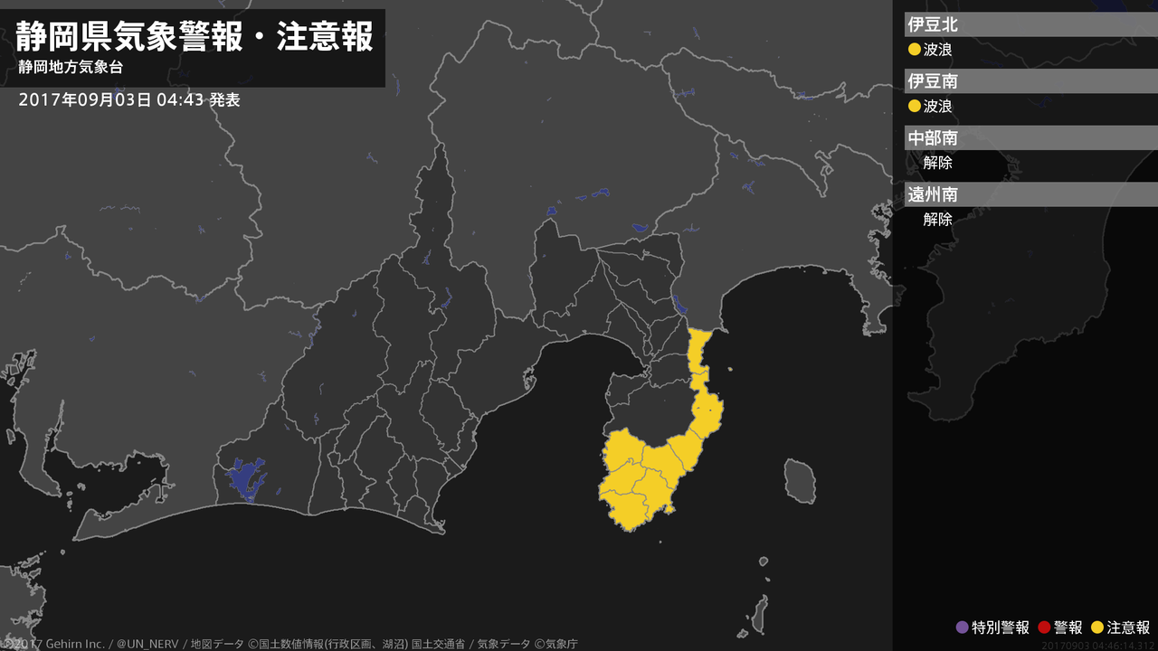 【静岡県 気象警報・注意報 2017年09月03日 04:46】伊豆では、3日夜遅くまで高波に注意してください。#気象警報注意報 #静岡県