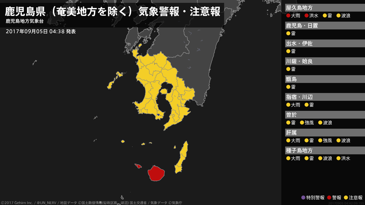 【鹿児島県(奄美地方を除く) 気象警報 2017年09月05日 04:42】