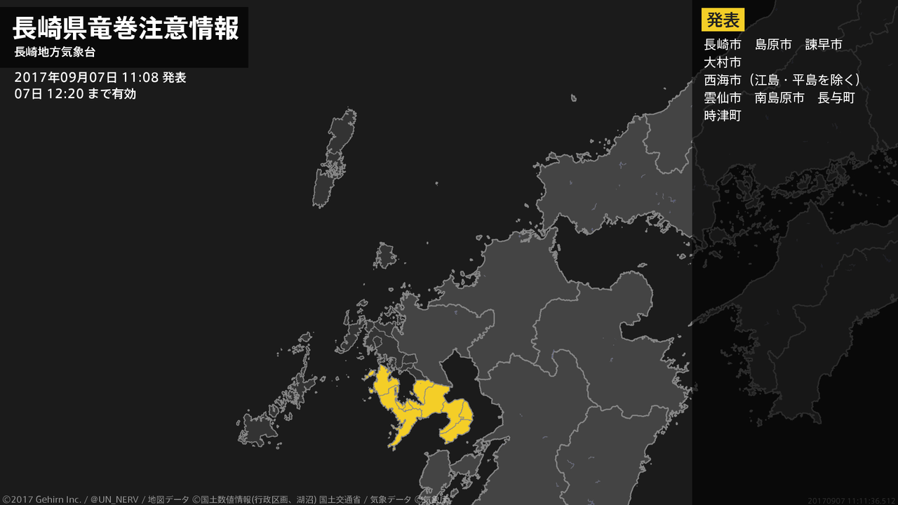 【長崎県 気象警報・注意報 2017年09月07日 11:06】長崎県では、土砂災害や強風、竜巻などの激しい突風、落雷に注意してください。南部、北部、壱岐・対馬では、高潮に注意してください。#気象警報注意報 #長崎県