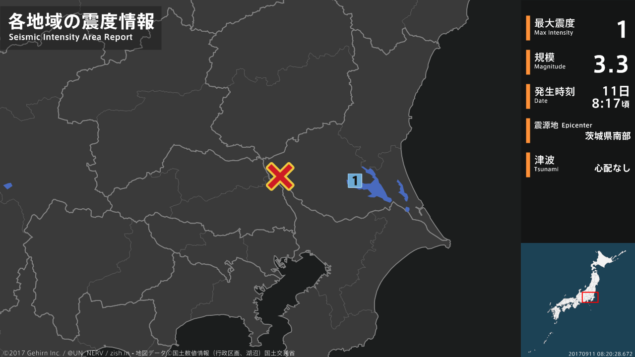 08時17分頃、茨城県南部を震源とする地震がありました。震源の深さは約50km、地震の規模はM3.3、最大震度1を茨城県で観測しています。この地震による津波の心配はありません。