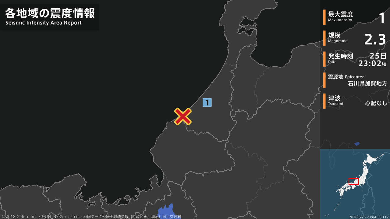23時02分頃、石川県加賀地方を震源とする地震がありました。震源の深さは約10km、地震の規模はM2.3、最大震度1を石川県で観測しています。この地震による津波の心配はありません。