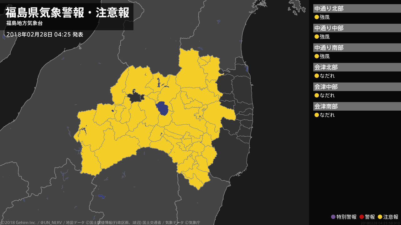 【福島県 気象警報・注意報 2018年02月28日 04:26】中通りでは、28日昼前まで強風に注意してください。会津では、1日までなだれに注意してください。#気象警報注意報 #福島県