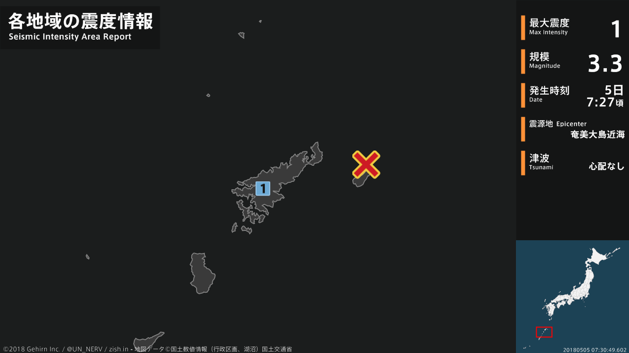 7時27分頃、奄美大島近海を震源とする地震がありました。今後の情報に注意してください。