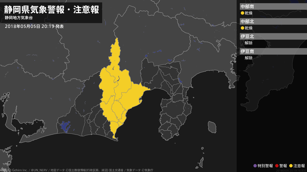 【静岡県 気象警報・注意報 2018年05月05日 20:19】中部では、6日まで空気の乾燥による火の取り扱いに注意してください。#気象警報注意報 #静岡県