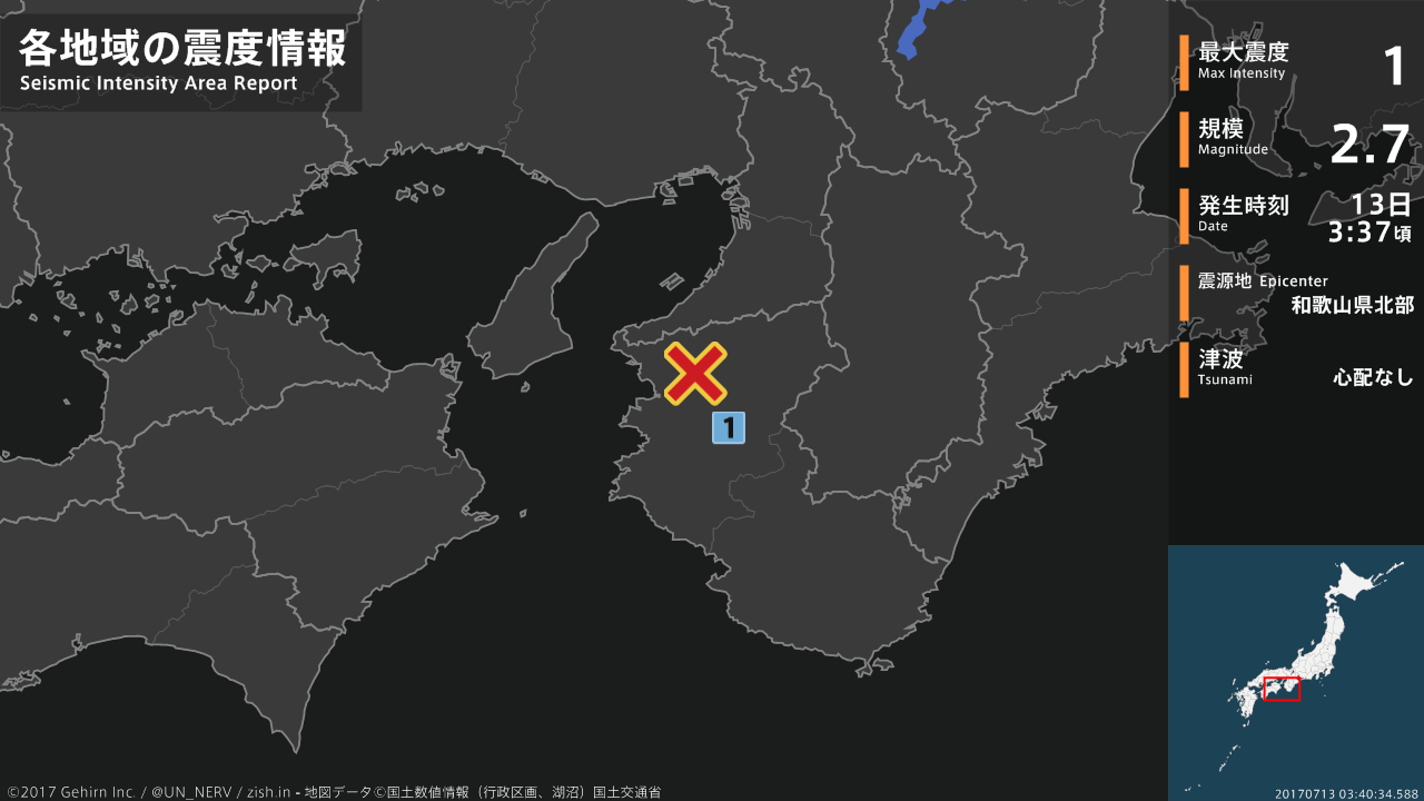 【地震情報 2017年7月13日】03時37分頃、和歌山県北部を震源とする地震がありました。震源の深さは約10km、地震の規模はM2.7、最大震度1を和歌山県で観測しています。この地震による津波の心配はありません。#地震 #和歌山県