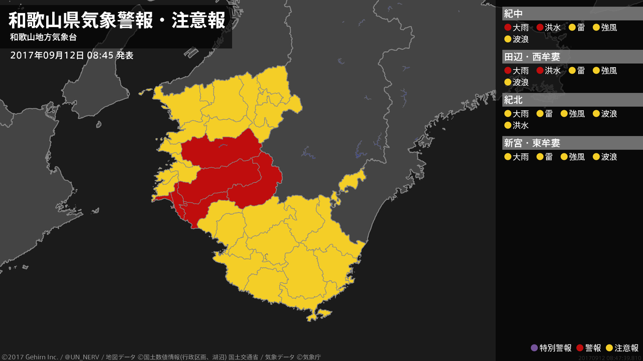 【和歌山県 気象警報・注意報 2017年09月12日 08:15】和歌山県では、12日昼前まで土砂災害や低い土地の浸水、河川の増水に警戒してください。#気象警報注意報 #和歌山県