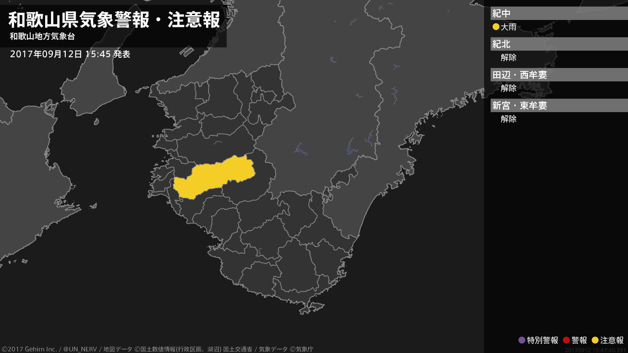 【和歌山県 気象警報(解除) 2017年09月12日 11:41】和歌山県に発表されていた気象警報はすべて解除されました。#気象警報 #和歌山県