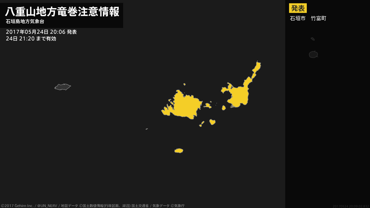 【八重山地方 竜巻注意情報】八重山地方は、竜巻などの激しい突風が発生しやすい気象状況になっています。頑丈な建物内に移動するなど安全確保に努めてください。この情報は24日21:20まで有効です。#竜巻注意情報 #八重山地方