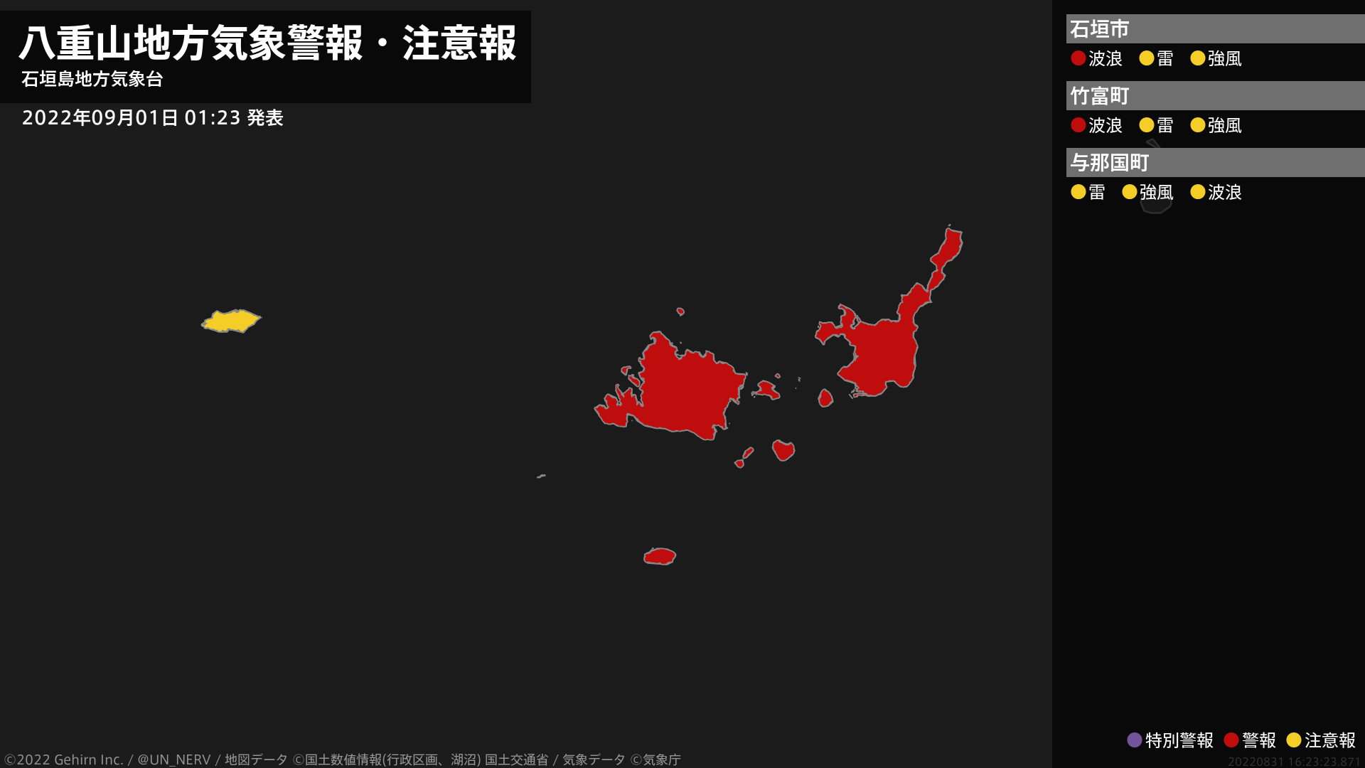 【八重山地方 気象警報 2022年09月01日 01:23】石垣島地方では、1日朝から1日夜遅くまで高波に警戒してください。#気象警報 #気象警報注意報 #八重山地方