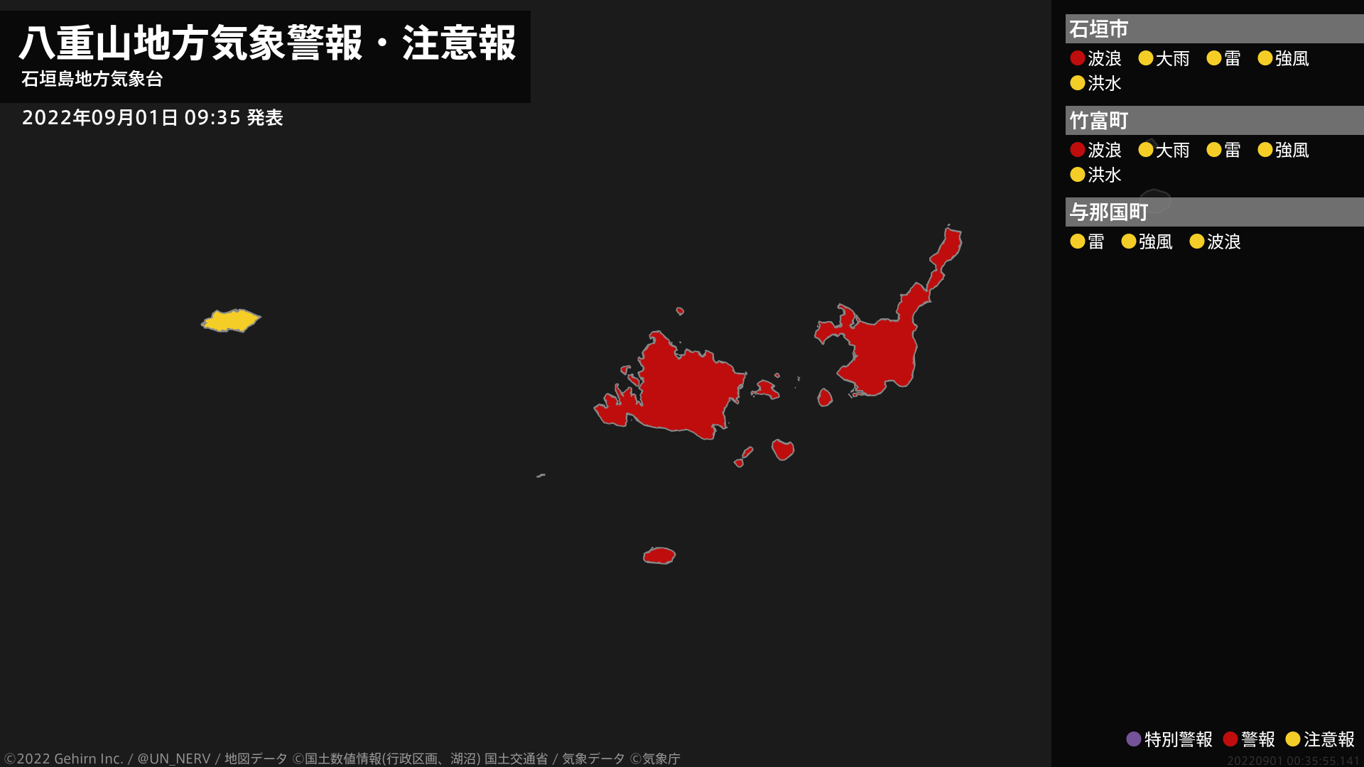 【八重山地方 気象警報・注意報 2022年09月01日 09:35】石垣島地方では、高波に警戒してください。#気象警報注意報 #八重山地方