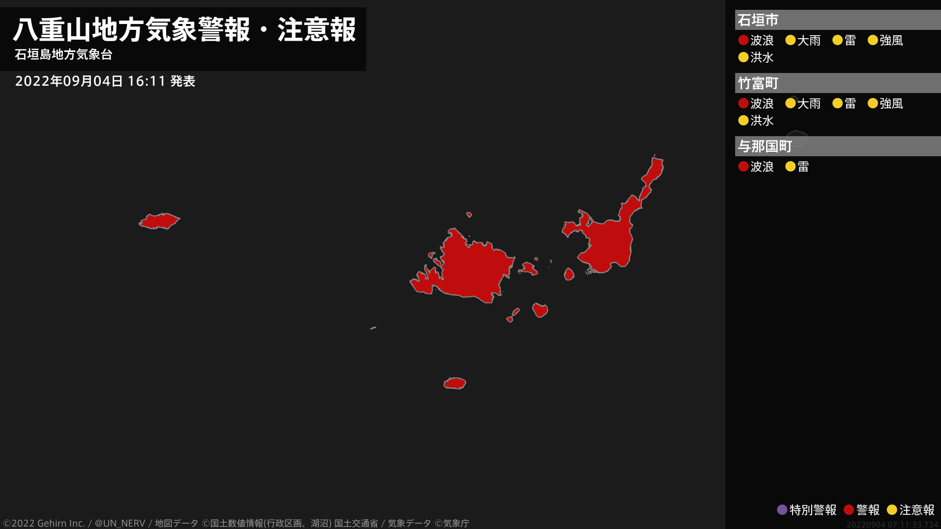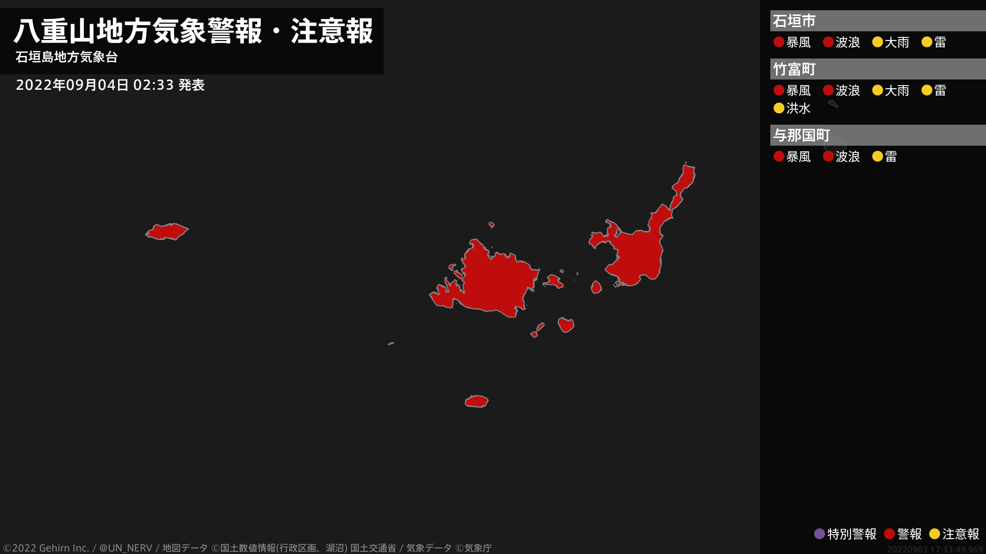 【八重山地方 気象警報 2022年09月04日 02:33】八重山地方では、暴風や高波に警戒してください。#気象警報 #気象警報注意報 #八重山地方