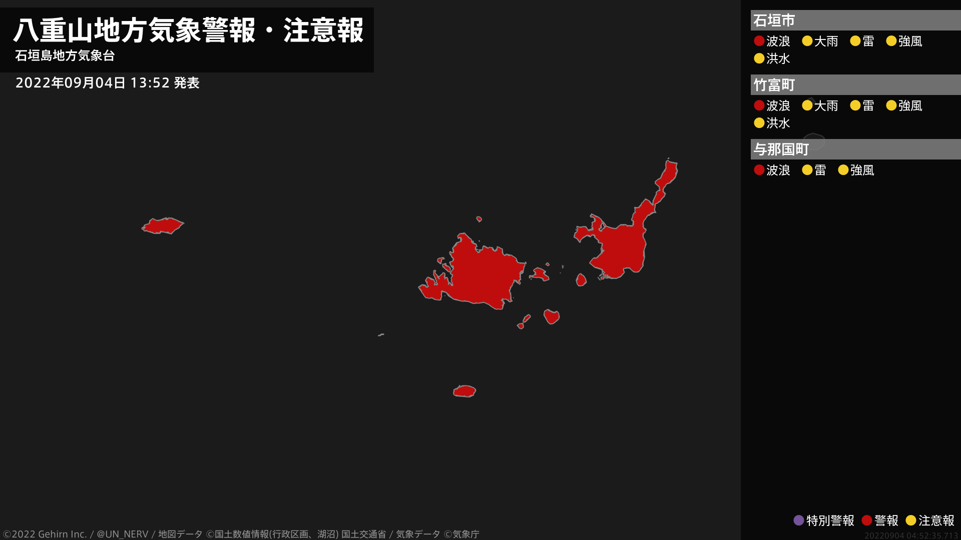 【八重山地方 気象警報 2022年09月04日 13:52】八重山地方では、高波に警戒してください。#気象警報 #気象警報注意報 #八重山地方
